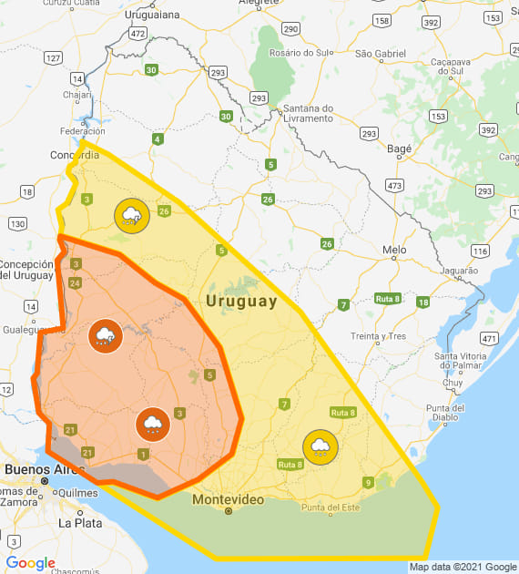 Perturbación atmosférica asociada a masa de aire húmeda e inestable afecta el país, generando tormentas algunas puntualmente fuertes. Cabe destacar que en zonas de tormentas se podrán registrar lluvias intensas en cortos períodos, ocasional caída de granizo, intensa actividad eléctrica y rachas de viento muy fuertes.